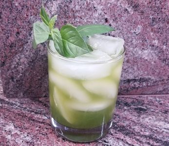 Add Gin, Lemon juice, and simple syrup with ice. Shake, shake, shake. Double strain into glass. Garnish with Basil sprig.