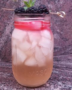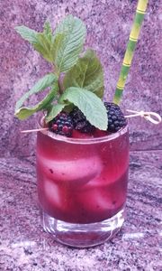 Muddle Mint and Blackberries in shaker. Add other ingredients. Shake. Strain into rocks glass with crushed ice. Garnish with Mint and Blackberries.