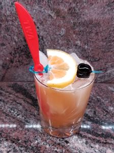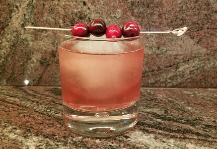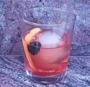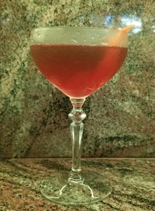 Garnish with a Lemon twist and a Luxardo maraschino cherry.