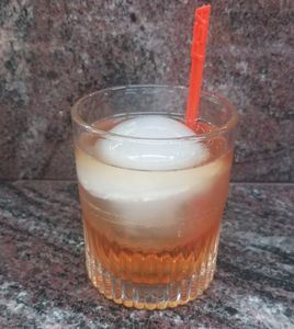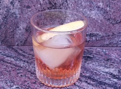 Mix. Stir. Strain. Old Fashioned glass with large ice cube. Lemon twist.